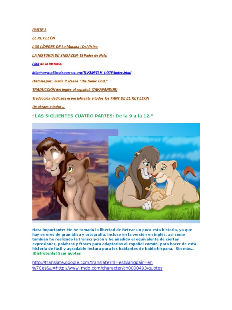 El Rey León Shisazen Padre De Nala Tercera Parte León Traducciones https://es.scribd.com/document/269293446/El-Rey-Leon-Shisazen-Padre-de-Nala-TERCERA-PARTE